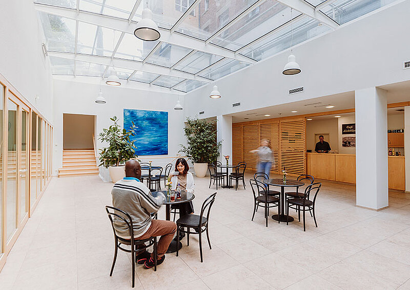 Unser hausinternes Café Lichtblick befindet sich an einem lichtdurchfluteten Ort mitten im Krankenhaus und wird somit gerne für Treffen und Gespräche von Patientinnen und Patienten sowie deren Angehörigen und Gästen genutzt. Auch für die Öffentlichkeit zugängliche Abendveranstaltungen finden hier immer wieder statt.